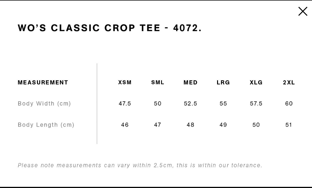 Neck ribbing, cropped full length, side seamed, shoulder to shoulder tape, double needle hems, preshrunk to minimise shrinkage
